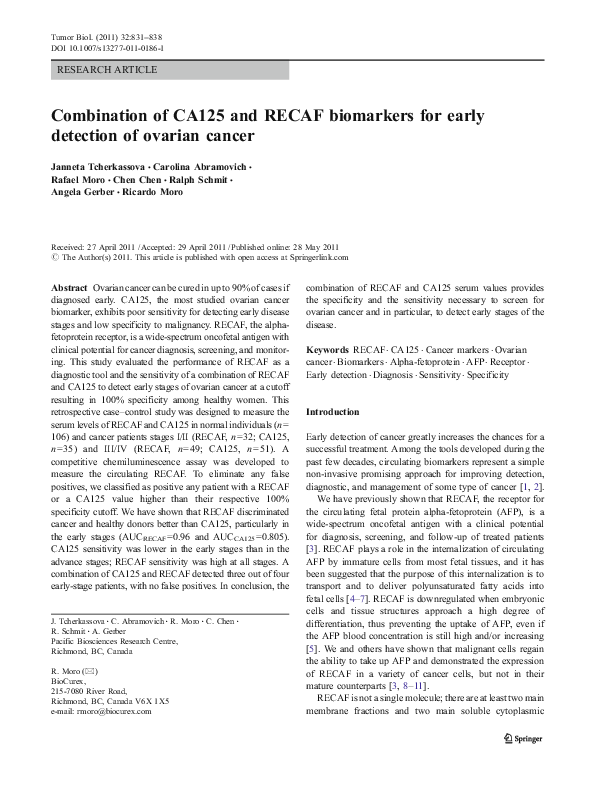 Ca125 is the gold standard tumor marker in ovarian cancer. Those who have above a certain level of ca125 in their blood are advised to follow on with further tests, such as an ultrasound. Cancer antigen 125 (ca125) is a protein found on most ovarian cancer cells that is secreted into the blood stream and can be measured. May signal ovarian cancer, ovarian cancer recurrence, and breast cancer recurrence. Serum level of ca125 is used to monitor response to chemotherapy, relapse, and disease progression in ovarian cancer patients. Ca 125 (cancer antigenany substance capable of being recognized by the immune system. Usually done to look for early signs of ovarian cancer in women at high risk for developing ovarian cancer. Cancer antigen 125 (also known as carbohydrate antigen 125 or ca 125) is an antigen first identified by bast et al. 125 threshold to 30 u/ml can likely detect cancers at an earlier stage, however at the same time. If rising ca 125 levels are detected, enrollment in a clinical trial or observation until onset of symptoms or clinically detected disease arises is ovarian cancer is only one of several conditions, benign and malignant, that can cause elevations in ca 125. Ca125 (carbohydrate antigen 125) provides useful information for patients with a known diagnosis of ovarian cancer, but as a solitary value it is of limited use in screening in the general population. Ca125 is a heavily glycosylated mucin protein and was first identified as an ovarian cancer antigen in 1981. Peter frederick answers frequently asked questions about this blood test.
